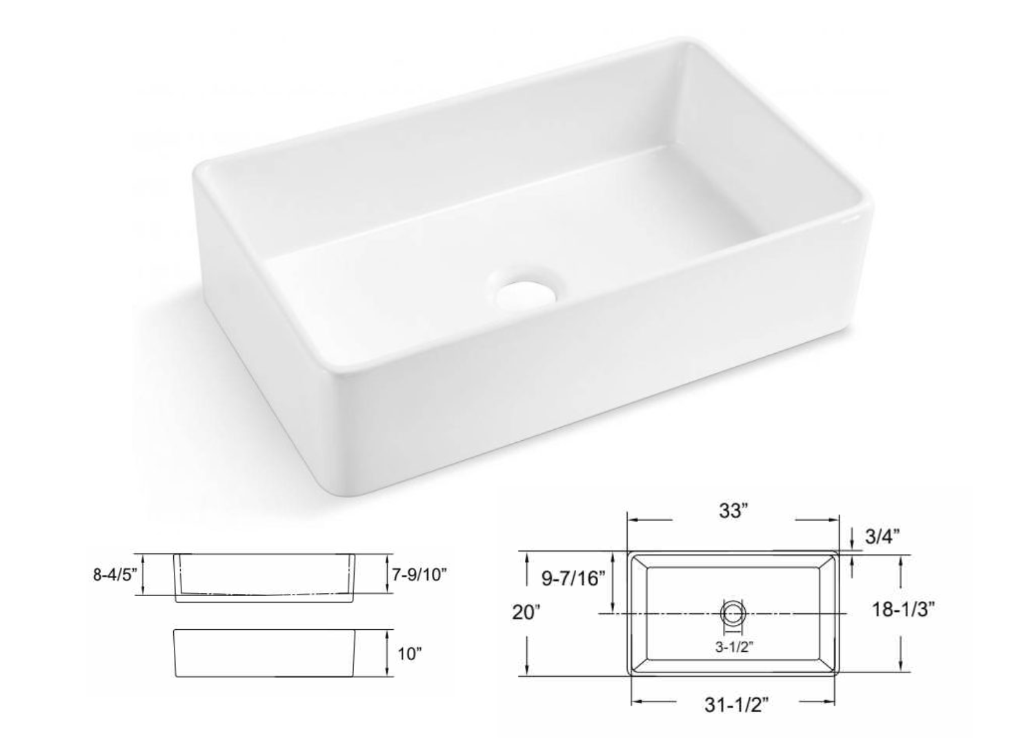 33″ Single Bowl Porcelain Apron Farm Sink